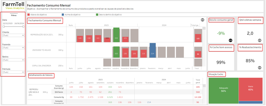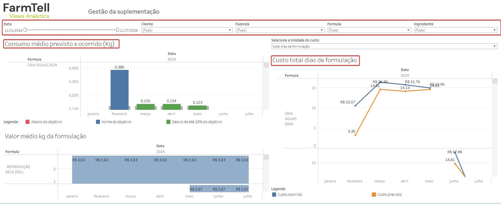 Compare el consumo previsto con el ocurrido por cabeza/día e identifique rápidamente desviaciones en el suministro de la suplementación. También haga un seguimiento del valor medio de las formulaciones mes a mes, con indicadores de costo previsto y realizado, para una gestión precisa de la nutrición del rebaño.