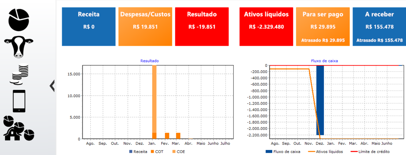 Sigue de manera práctica y realista las cuentas de tu granja de leche. Visualiza los activos líquidos, compara el flujo de caja previsto y realizado, y consulta gráficos del resultado financiero. Además, ten a mano el total de gastos del mes o del año en curso, facilitando el control y la planificación económica de la propiedad.